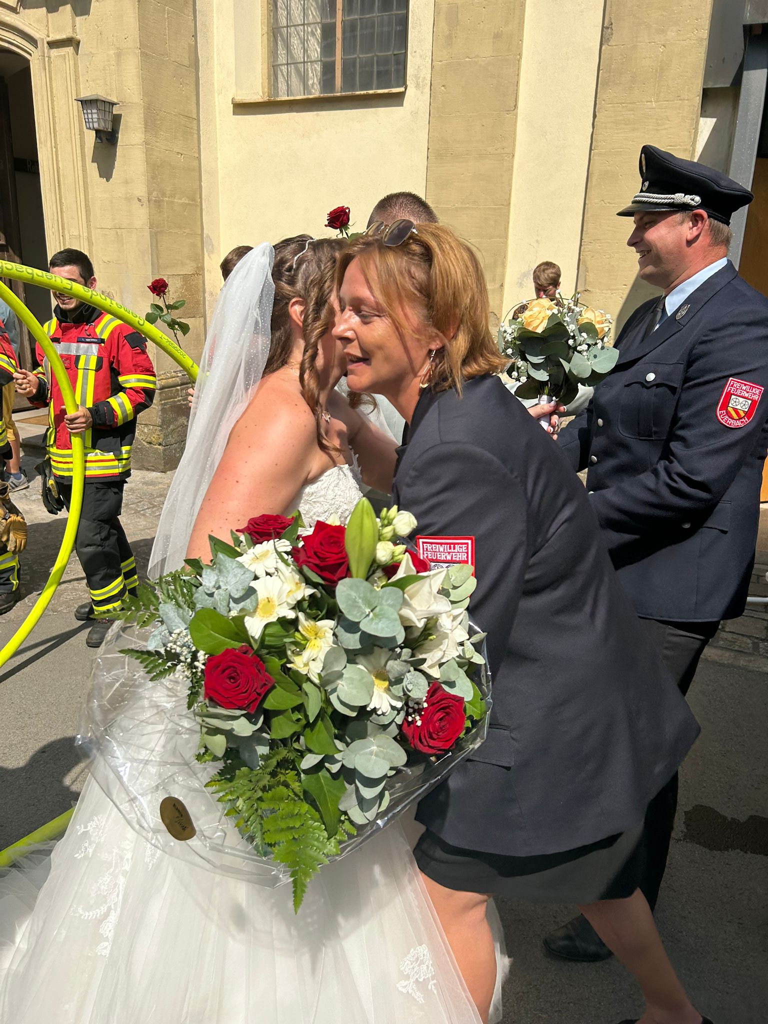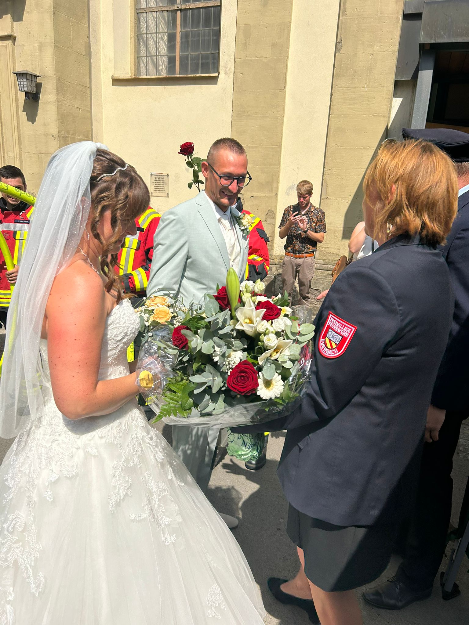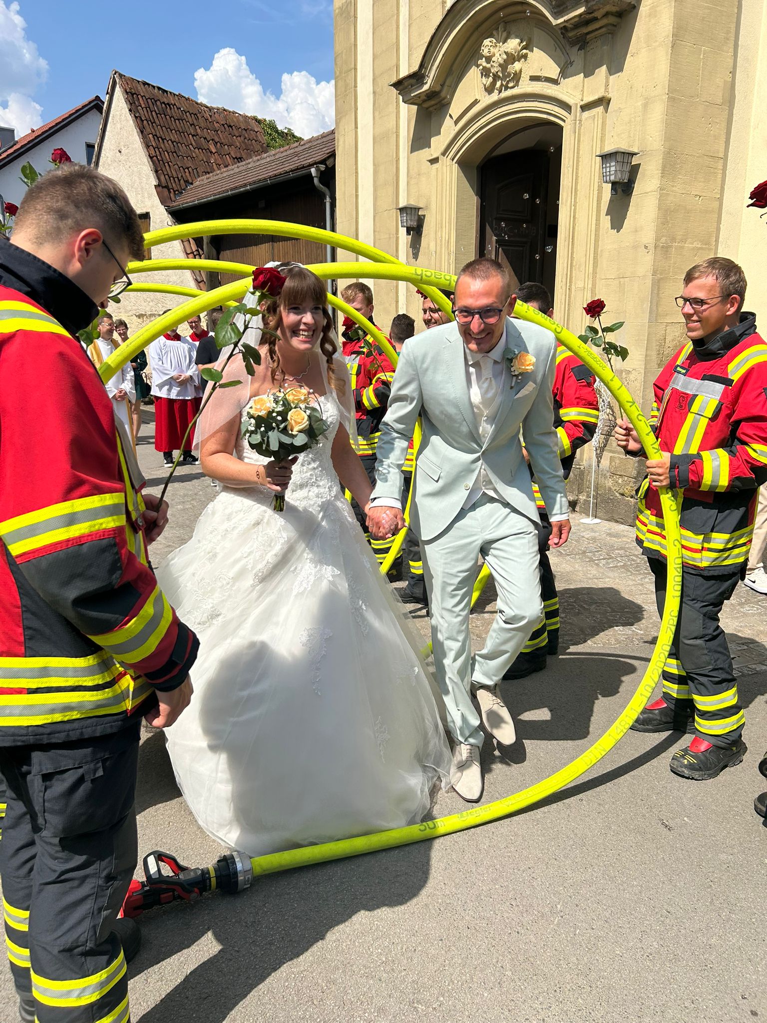 Eine Abordnung der Aktiven Kameraden stand bei brütender Hitze zusammen mit unserem ersten Kommandanten Philipp Kirchner und unserer Vereinsvorsitzenden und Bürgermeisterin Simone Seufert dem jungen Brautpaar Spalier.